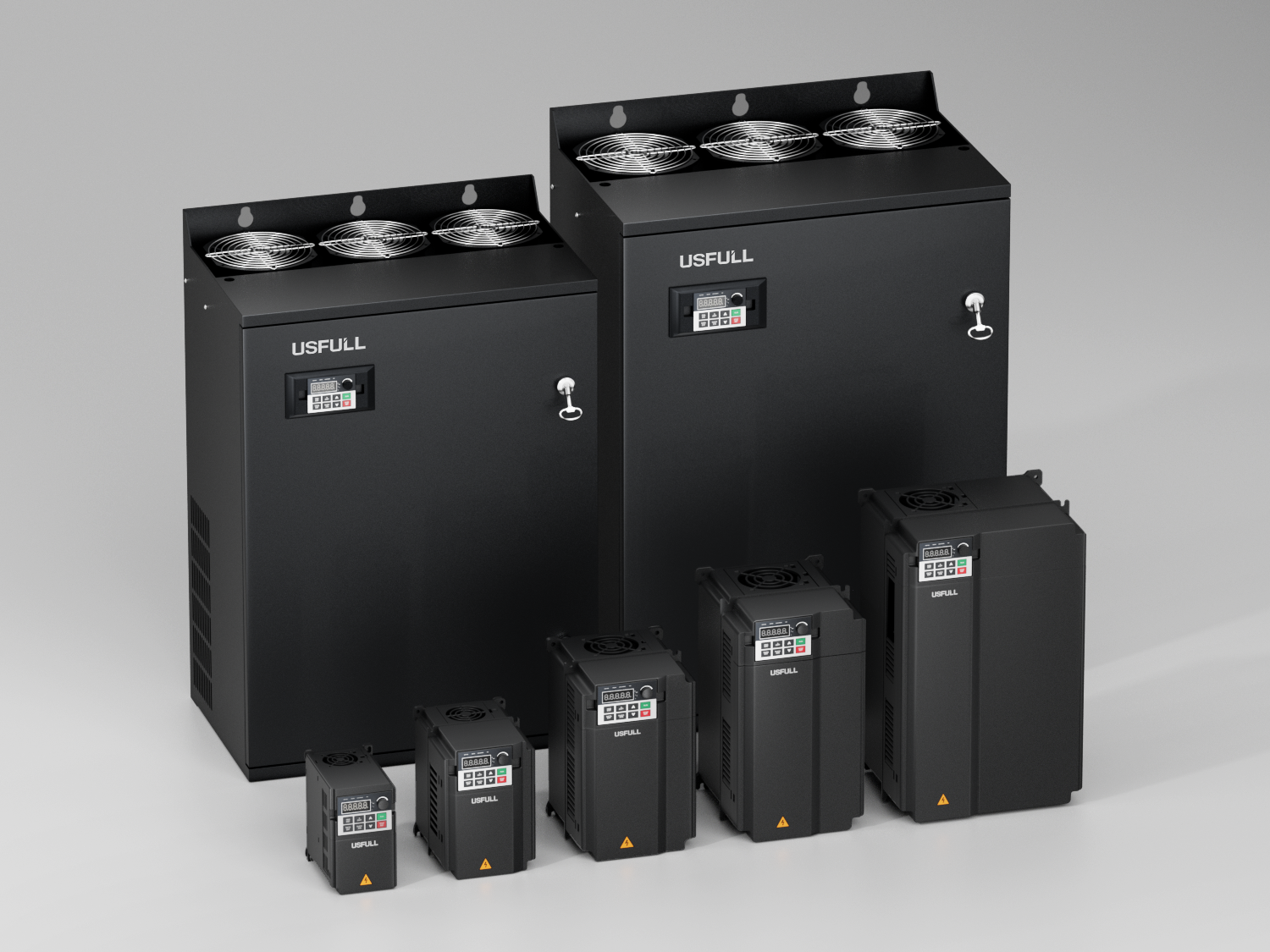USFULL生產涵蓋全功率范圍(0.75kW至630kW)的逆變器,包括通用型號以及針對風扇、水泵、機床主軸等應用的專用型號,能夠滿足精確速度調節和節能的需求。采用智能制造和全流程質量控制。